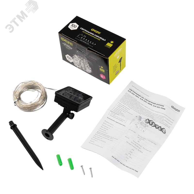 Светодиодный светильник-гирлянда 'ДЕКОРАТИВНАЯ НИТЬ' с солнечной батареей. Предназначен для декоративной подсветки кустарников, альпийских горок, террас, веранд на садовых и дачных участках, балконов и т.п. Автоматическое включение/выключение при наступлении темного/светлого времени суток (датчик освещенности). 8 режимов работы - комбинированный, волнообразный, последовательный, перетекающий, бегущая вспышка, затухающий, мерцающий, постоянный. Время непрерывной работы при полностью заряженном аккумуляторе 8 часов. Материал корпуса светодиодной панели и колышка – ABS-пластик, в гирлянде используется медный провод. Светильник можно устанавливать в грунт и на вертикальную поверхность. Крепеж (два самореза и дюбеля) входит в комплект поставки.