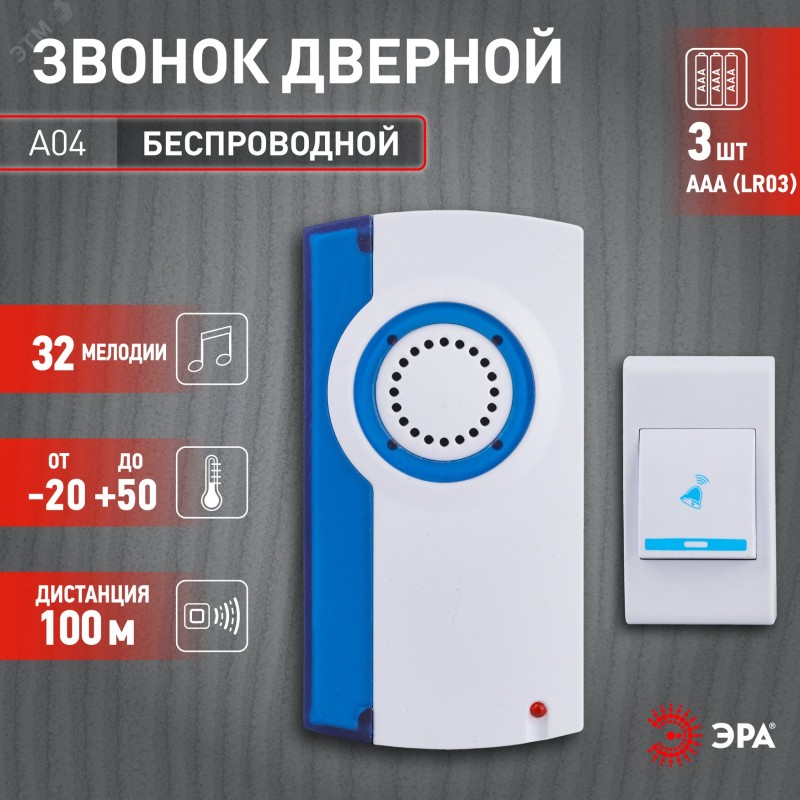 ЭРА А04 - универсальный аналоговый дверной звонок на батарейках. Много мелодий (32 полифонические мелодии!) - это позволяет найти самый комфортный звук для всех жителей квартиры или дома. Звонок придверный устанавливается быстро и без проблем, так как не требует подключения к электросети. Работает от 3 мизинчиковых батареек (3 х ААА). Удобная эргономичная кнопка. Широкий радиус действия кнопки - 100 метров. Отличный динамик! Звонок от торговой марки ЭРА отлично впишется в любой интерьер, благодаря аккуратному дизайну.