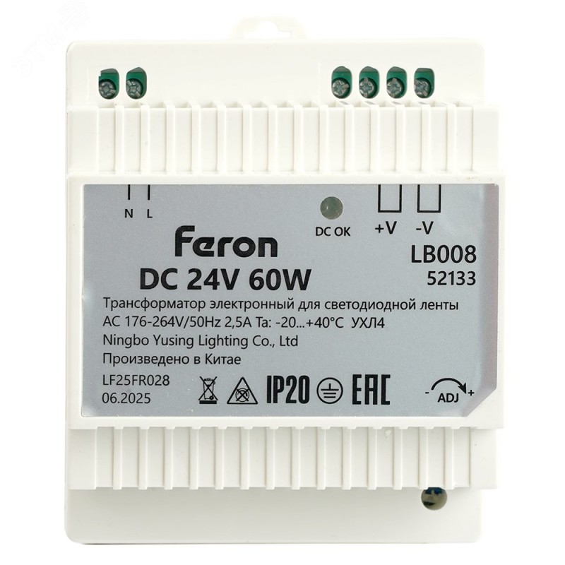 Трансформатор электронный для светодиодной ленты и оборудования на DIN-рейку 60W 24V 77*92*56мм IP20, LB008. Мощность 60W — питает протяженные участки светодиодных лент без потерь яркости. Удобный монтаж на DIN-рейку — быстрое и надежное крепление в электрощитовой. Компактные размеры (77*92*56 мм) — экономия места в распределительном шкафу. Стабильное напряжение 24V — защита от мерцания и перепадов. Защита IP20 — безопасная работа в сухих помещениях. ПОЧЕМУ LB008 — ЛУЧШИЙ ВЫБОР. Простота установки — защелкивается на DIN-рейку за секунды. Защита от КЗ. Защита от перегрузки. Защита от перенапряжения. Защита от перегрева. Низкий нагрев — эффективное охлаждение даже при длительной работе. Совместимость с большинством систем управления.