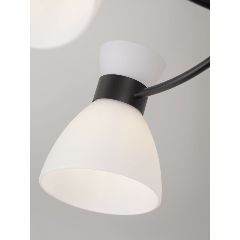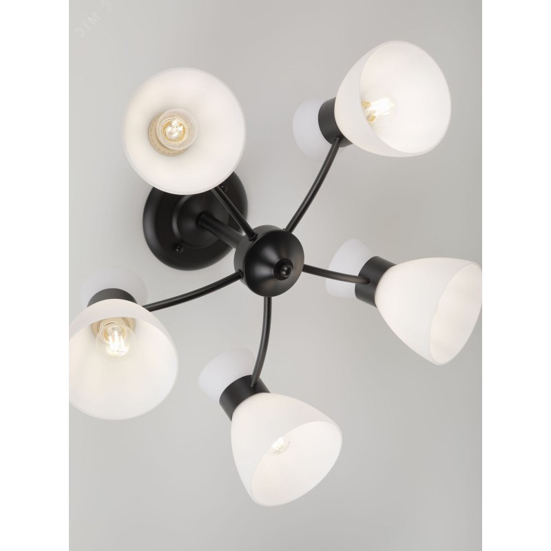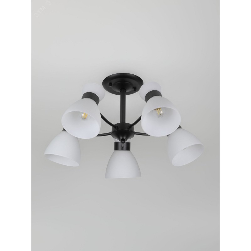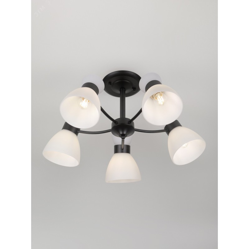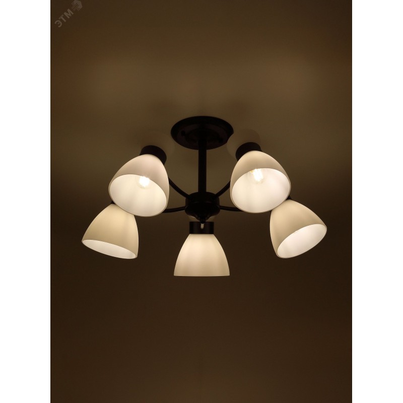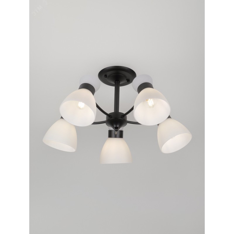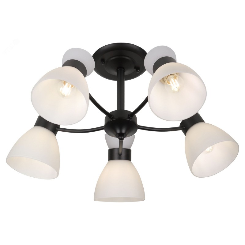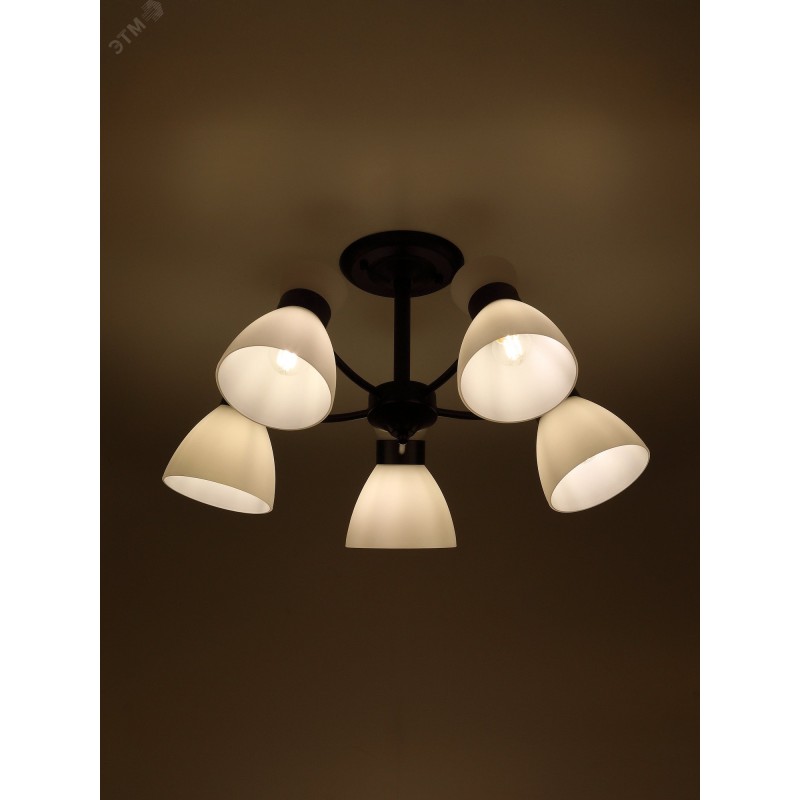 Серия чёрных светильников с опаловыми плафонами — стильное и функциональное решение для современного интерьера. В коллекции люстры на 5 и 8 ламп, а также бра с удобным выключателем-цепочкой. Подходят лампы с цоколем E27, мощностью до 60 Вт (лампы в комплект не входят).