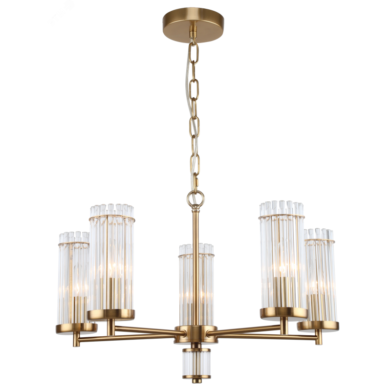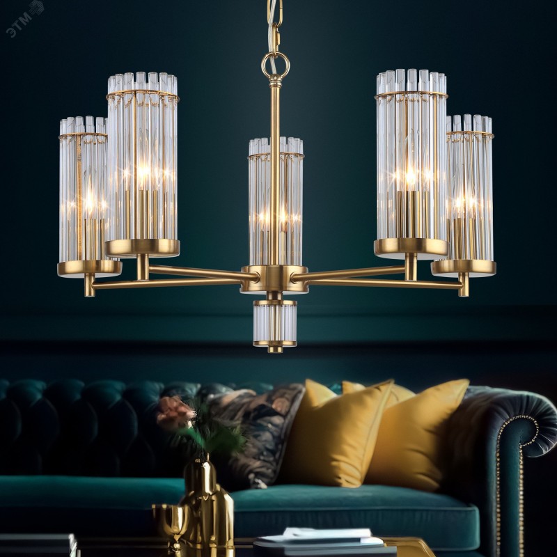 Коллекция дизайнерских люстр в классическом стиле Rivoli Dolly включает в себя: люстры подвесные под 5 ламп – арт. 2074-305, подвесные люстры под 7 ламп – арт. 2074-307, классические люстры потолочные под 12 ламп – арт. 2074-312, бра настенное – арт. 2074-401. Коллекцию отличает гальваническое окрашивание металла в цвет латуни и плафоны из прозрачных стеклянных трубочек. Данная люстра на потолок освещает площадь до 15 м2, к ней подходят лампы Е14 40 Вт, 5 шт. Такую люстру потолочную стоит купить в гостиную, спальню, в кабинет, на кухню, в загородный дом. Люстра металлическая с лаконичным дизайном поможет оформить пространства в стиле классика, современная классика, лофт, модерн. Высота подвеса люстры регулируется при монтаже.