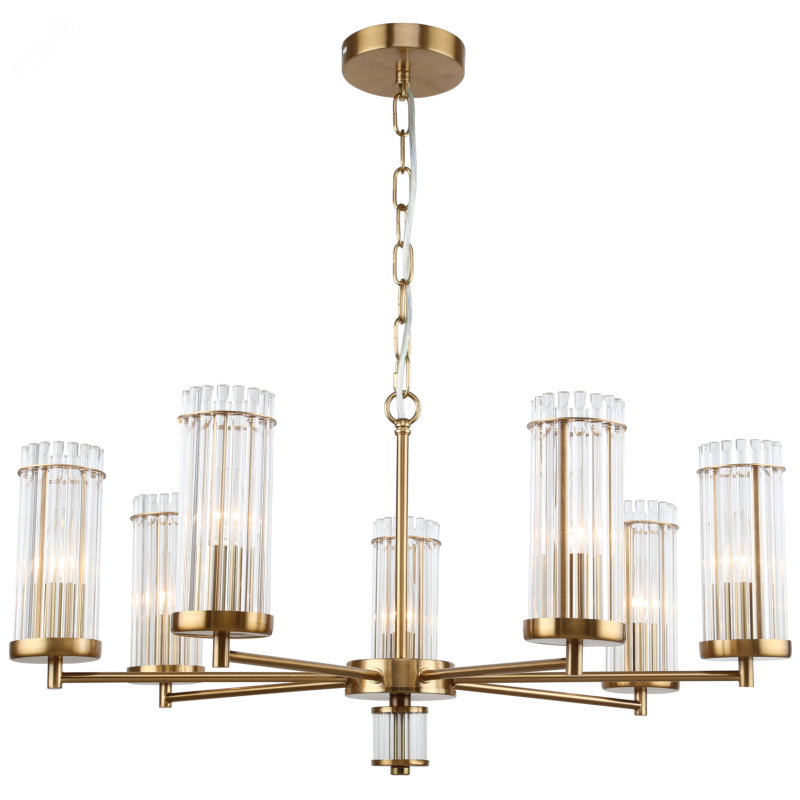 Дизайнерская коллекция Rivoli Dolly включает в себя подвесные люстры под разное количество ламп и позволяет создать грамотное основное освещение в пространствах разной площади: арт. 2074-305 – 5-рожковая люстра на потолок, арт. 2074-307 – люстра 7-рожковая, арт. 2074-312 – большая люстра под 12 ламп. Дополняет коллекцию бра (арт. 2074-401) для дополнительного освещения. Стеклянные плафоны из прозрачных трубочек, минималистичный золотистый корпус цвета латуни, декорированный эстетичной цепочкой подвес. Высоту подвешивания люстры можно регулировать при монтаже, что делает эту люстру классическую универсальной на любой потолок.