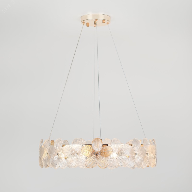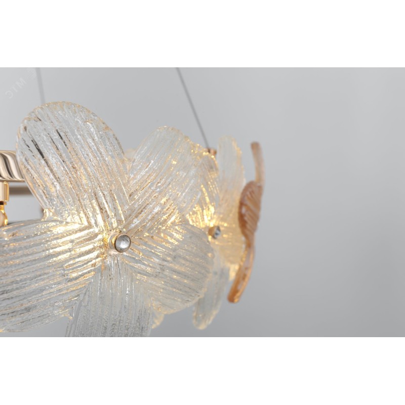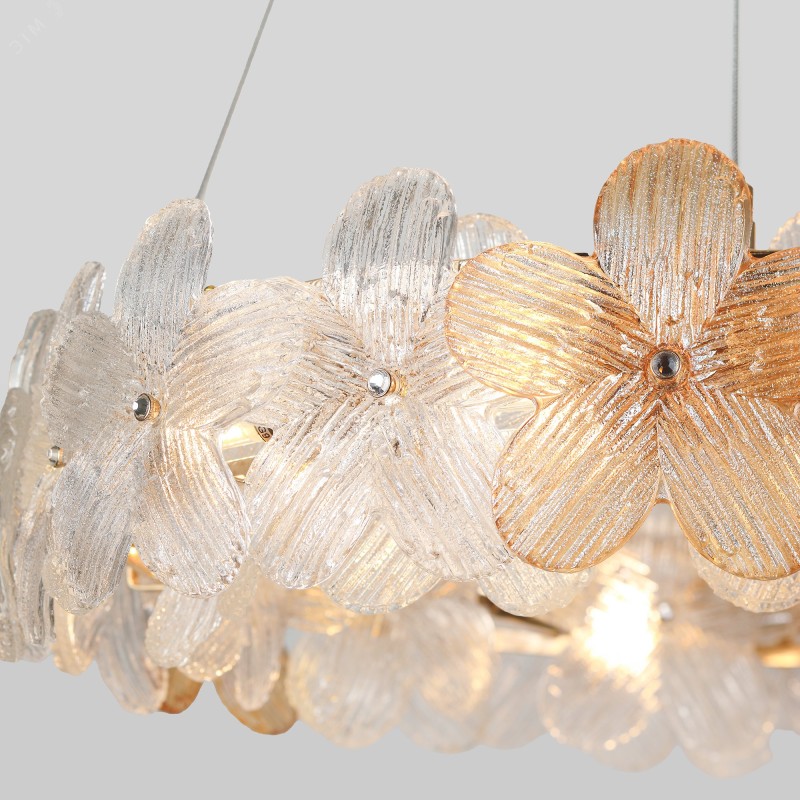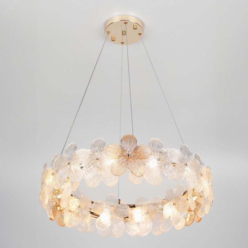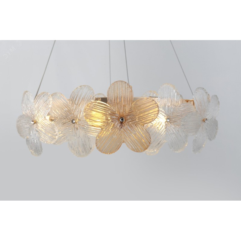 Люстра Rivoli Ethel (арт. 6132-101) — настоящая жемчужина в мире дизайнерского освещения. А точнее — прекрасный цветок! Выполненная в соответствии с актуальными европейскими трендами оформления интерьеров, она предлагает удивительно оригинальное решение для преображения пространства. Кольцевой плафон, украшенный стеклянными цветами, придаёт люстре уникальный и художественный вид, делая её центральным акцентом в любом интерьере. С золотой арматурой и диаметром 600 мм люстра не только элегантна, но и функциональна: регулируемая длина подвеса позволяет легко адаптировать её под высоту потолка. Люстра Rivoli Ethel применяется с 12 лампами G9 мощностью 5 Вт, создаёт яркое и мягкое освещение. Оригинальность и стиль этой люстры будут привлекать взгляды и вызывать восхищение. Такая подвесная дизайнерская люстра — удачный выбор для современных интерьеров, от уютных гостиных до роскошных залов. Подарите своему дому изысканность и неповторимость с люстрой Rivoli Ethel!