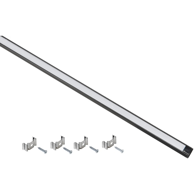 - Преимущества:Рассеиватель из поликарбоната мягко и равномерно распределяет свет и защищает ленту от механического воздействия|Черный матовый цвет профиля позволяет использовать его в проектах, подразумевающих черный дизайн|В комплекте с профилем поставляется всё необходимое для монтажа: торцевые заглушки, крепежные скобы и саморезы|Прочно крепится на разных поверхностях.