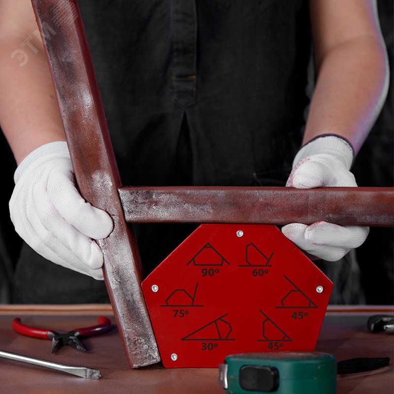 Доступны углы 30, 45, 60, 75, 90, 135 градусов|Позволяет удерживать до 11,3 кг|Быстро и надежно соединяет детали до процесса сварки|Все работы могут осуществляться одним человеком|Сокращает время работы, заменяя различные зажимы и струбцины|Профессиональный уровень материалов