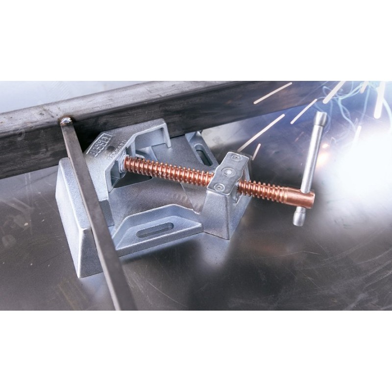 Шарнирно закреплённая маточная гайка позволяет автоматически настраивать губки на детали различной толщины|Проход позволяет фиксировать Т?образные соединения и обеспечивает свободный доступ к детали при сварочных работах|Стабильная основа и губки, выполненные из высококачественного чугуна, чтобы сильно зажимать детали|Винт с трапецеидальной резьбой покрыт медью, что препятствует налипанию брызг при сварке|Автоматическая настройка на детали разной толщины|Стабильные губки и основа из высококачественного чугуна